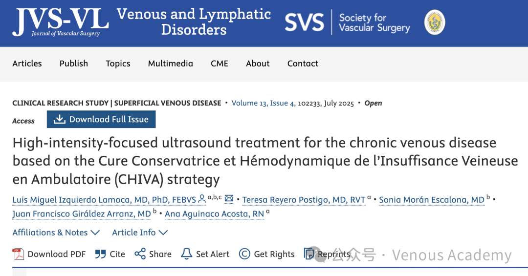 国际静脉病学领域在JVS-VL期刊发表了西班牙Luis Miguel Izquierdo团队一项引起广泛关注的研究,系统评估了高强度聚焦超声(High-Intensity Focused Ultrasound,HIFU)在 CHIVA策略指导下,用于慢性静脉病(Chronic Venous Disease, CVD)治疗的安全性与有效性。这一研究为“非侵入式能量治疗 + 血流动力学导向治疗”的结合,提供了迄今为止较为完整的临床证据。