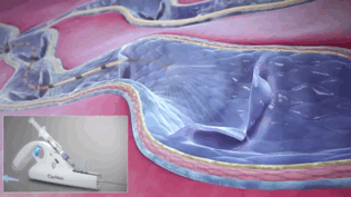 ClariVein导管 利用高速旋转的导丝,把硬化剂360度分散在静脉壁。适用于闭合大口径的大隐静脉主干。优点是没有热损伤,无需使用肿胀液注射,闭合相对可靠。目前大陆尚无上市,其并发症类似于硬化剂注射。