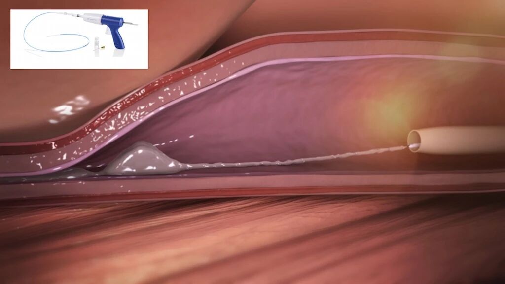 腔内胶合(VenaSeal)由美敦力公司出品,优点是避免了射频技术所需要的肿胀液注射。其原理是利用导管向静脉注射粘合剂,达到闭合静脉的效果。目前大陆还没有上市,其长期效果和并发症还有待验证。