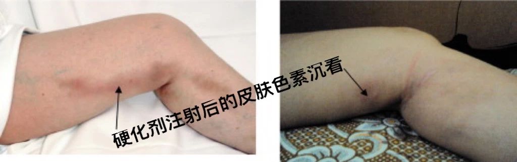 硬化剂注射治疗静脉曲张的方法比大隐静脉剥脱手术更早。早在1835年,美国麻省州立医院已经尝试注射疗法,但因为效果不佳没有推广。50年代,由于硬化剂鱼肝油酸钠的出现,硬化治疗又开始得到应用。因为无需麻醉,无需开刀,费用低廉,早在70年代在我国基层医院也曾经广泛使用。然而,硬化剂注射存在着巨大的风险;一是硬化剂注射液外渗的话,可导致皮肤坏死。二是硬化剂一旦流入深静脉,可导致血栓形成,严重者发生肺栓塞。三是患者治疗后遗留不同程度的色素沉着,影响美观。四是短暂性神经损伤或视觉障碍。五是极少数患者出现过敏性休克。